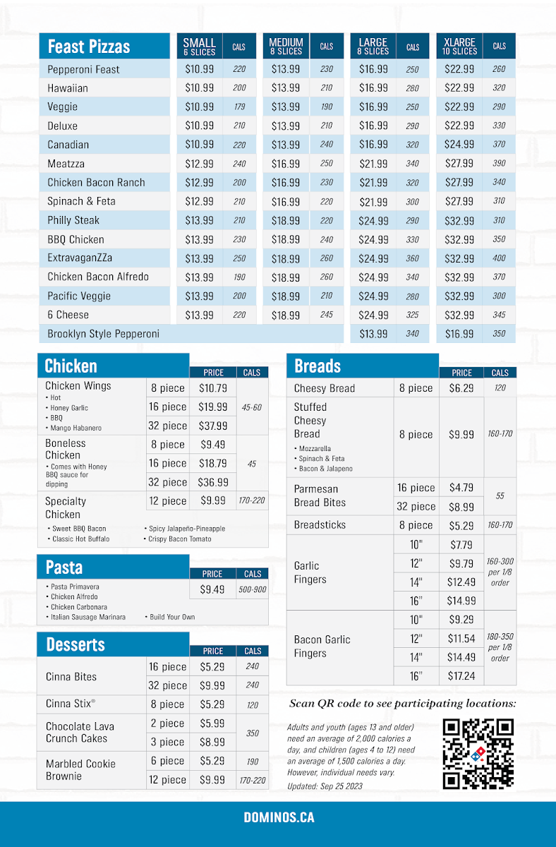 The menu extends beyond pizza, featuring flavorful wings like Honey Garlic, zesty Mango Habanero, and classic BBQ Wings, perfect for sharing or snacking. Multiple crust choices—from crunchy thin to handmade pan—allow for customization across medium, large, and extra-large sizes. The BBQ Feast with chicken and bacon and the creamy Chicken Bacon Alfredo Feast reveal Domino’s flair for bold and comforting flavors.